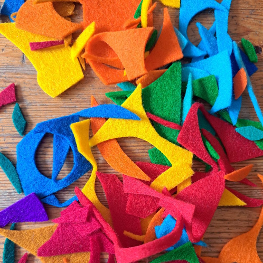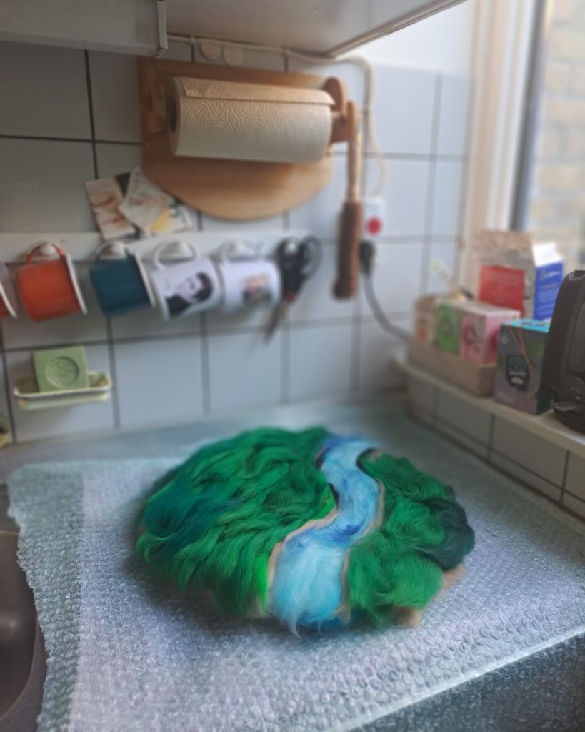 vilt; reststukjes van kabouterjasjes, kiezels van wol verpakt in panty’s om te vervilten in de wasmachine en een wollandschapje op het aanrecht ligt klaar voor het natvilten