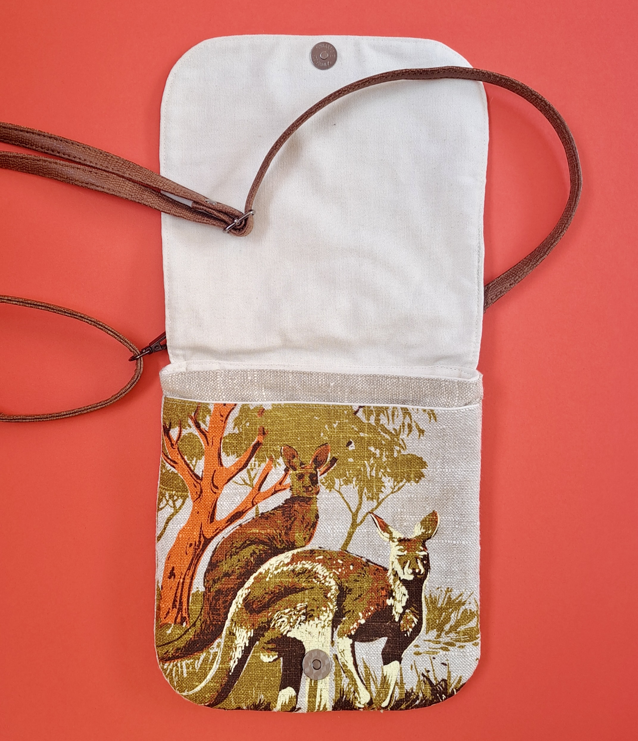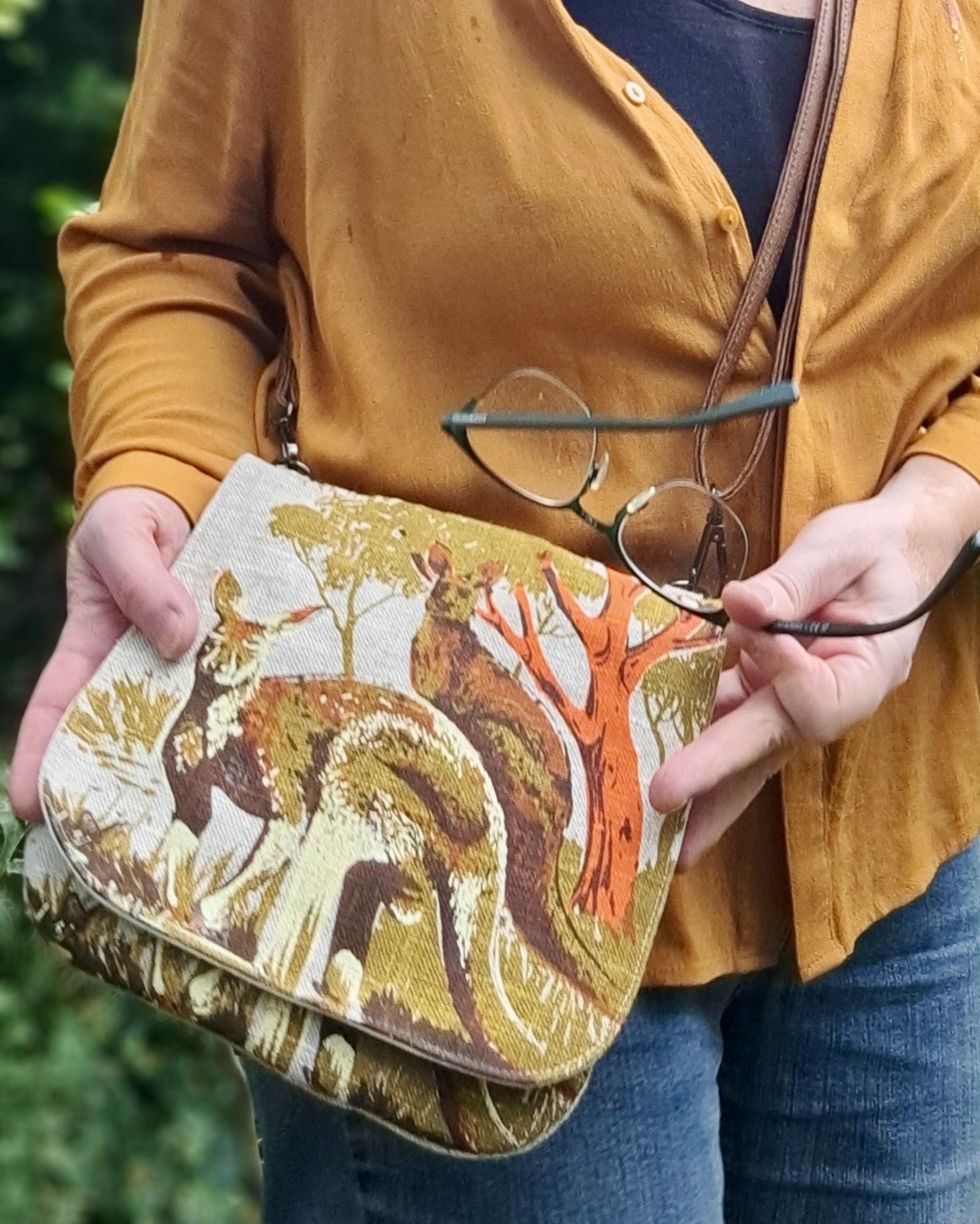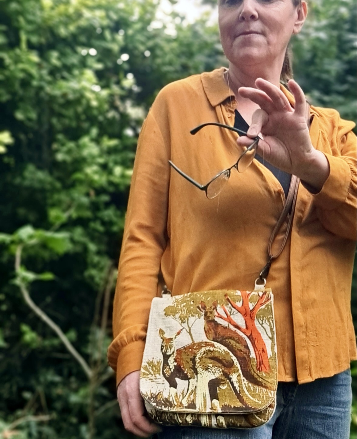 Het tasje is gemaakt van twee Australische placemats uit de Roemeniëschuur, een restje gordijnstof uit Simon z’n oude huis in de Vlissingse Bonedijkestraat en een riempje van Ramsjburg.