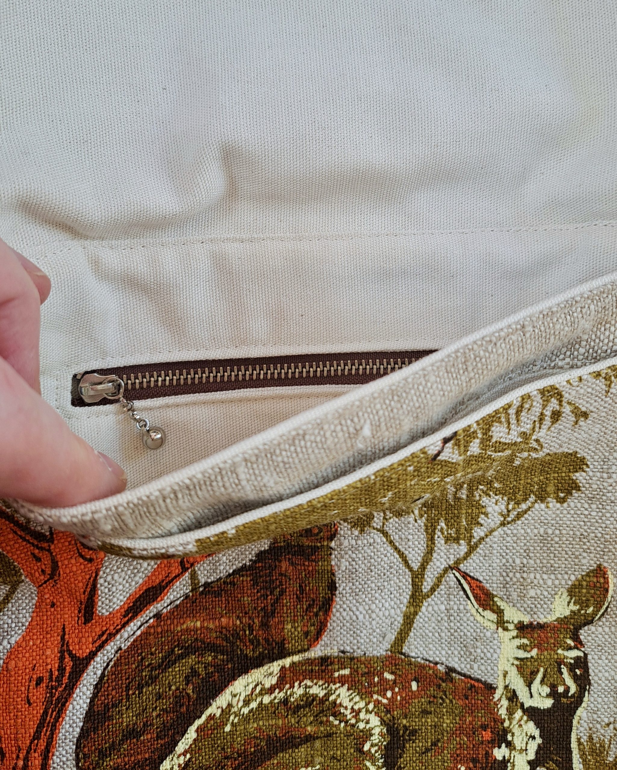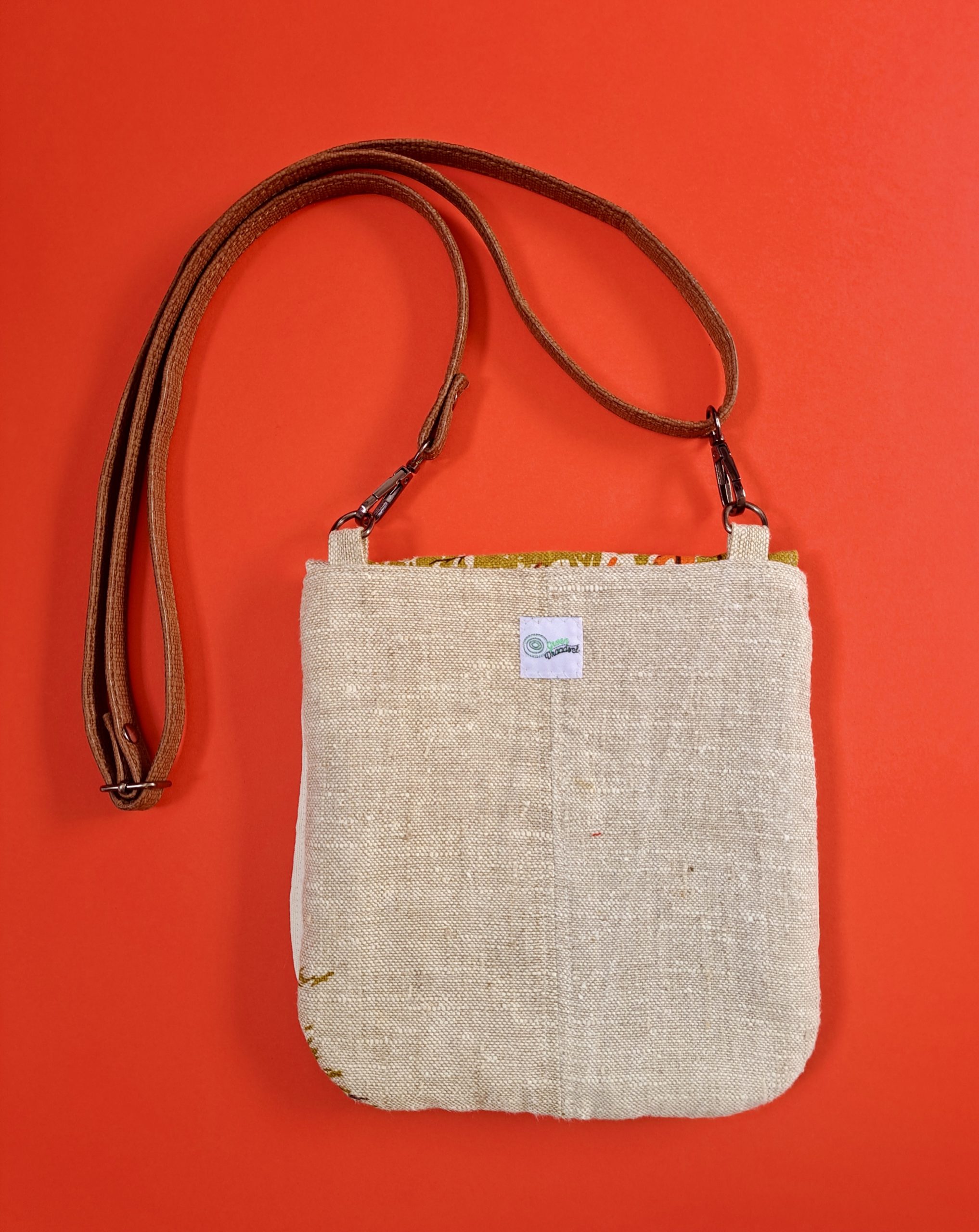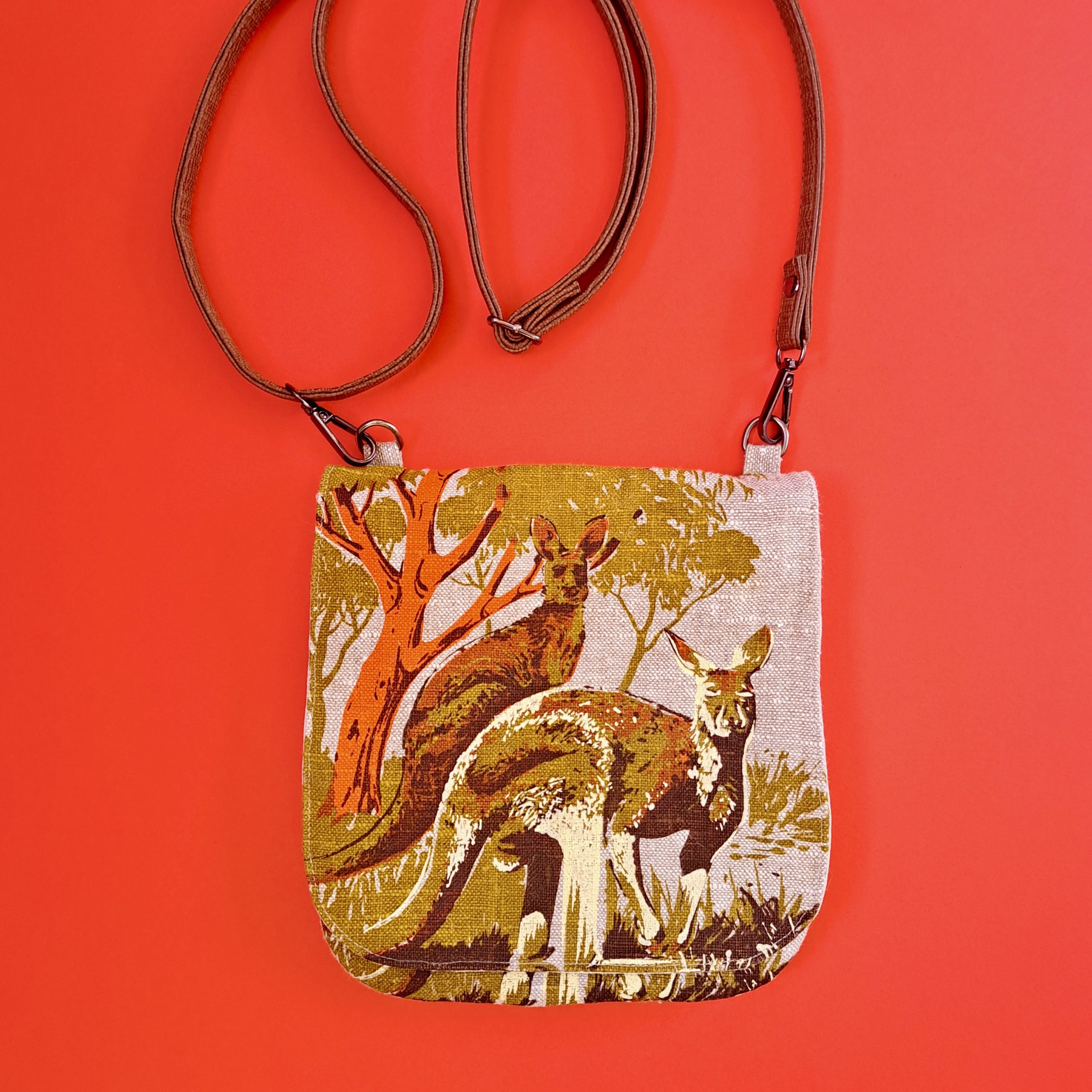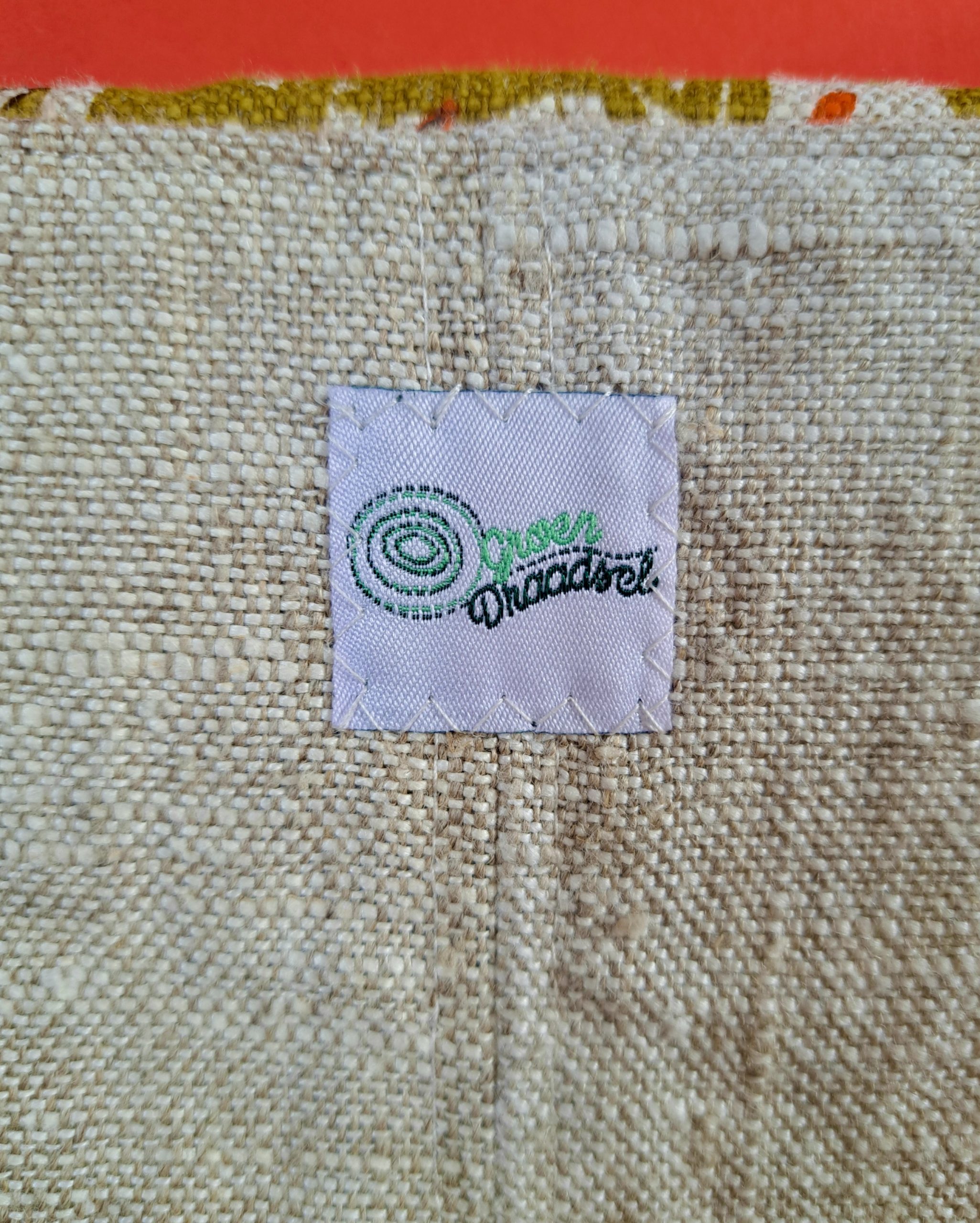 Het tasje is gemaakt van twee Australische placemats uit de Roemeniëschuur, een restje gordijnstof uit Simon z’n oude huis in de Vlissingse Bonedijkestraat en een riempje van Ramsjburg.
