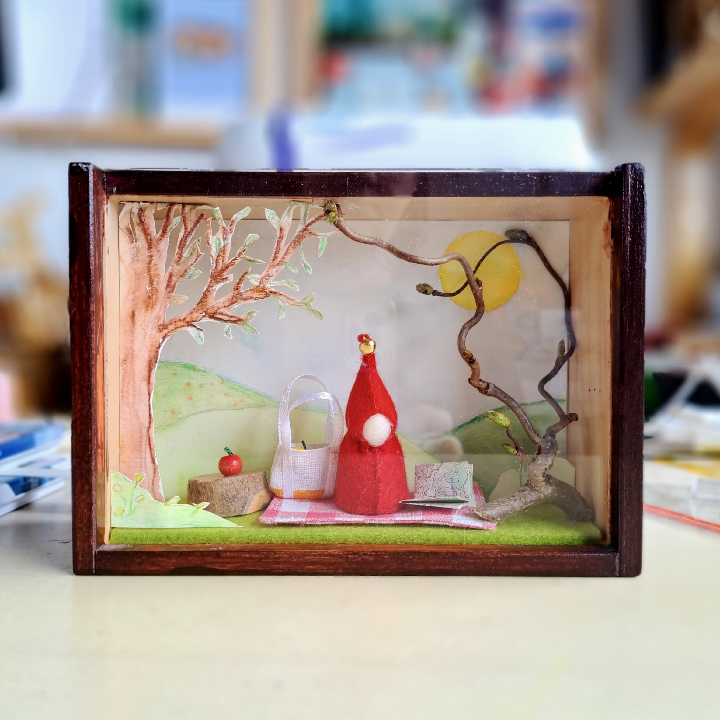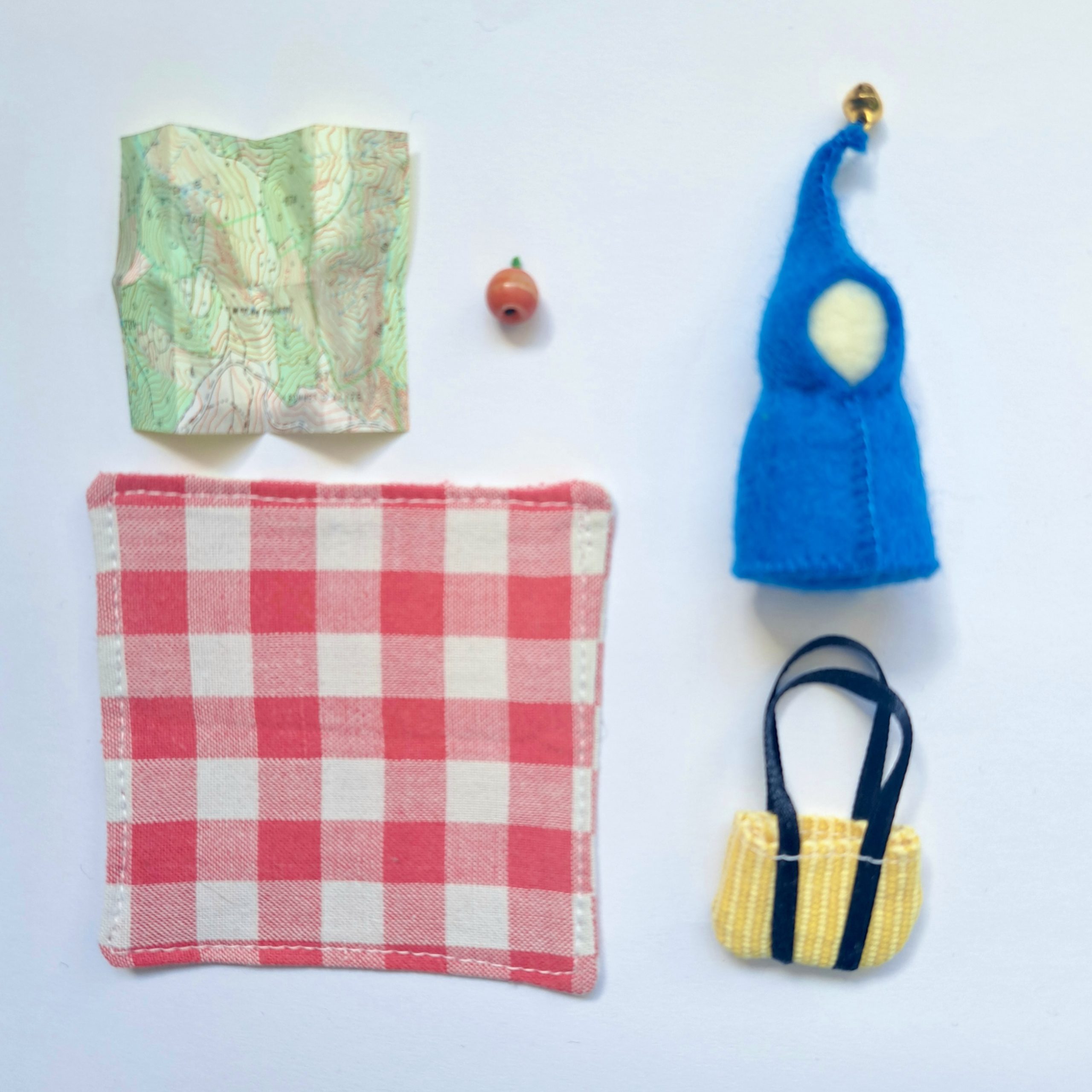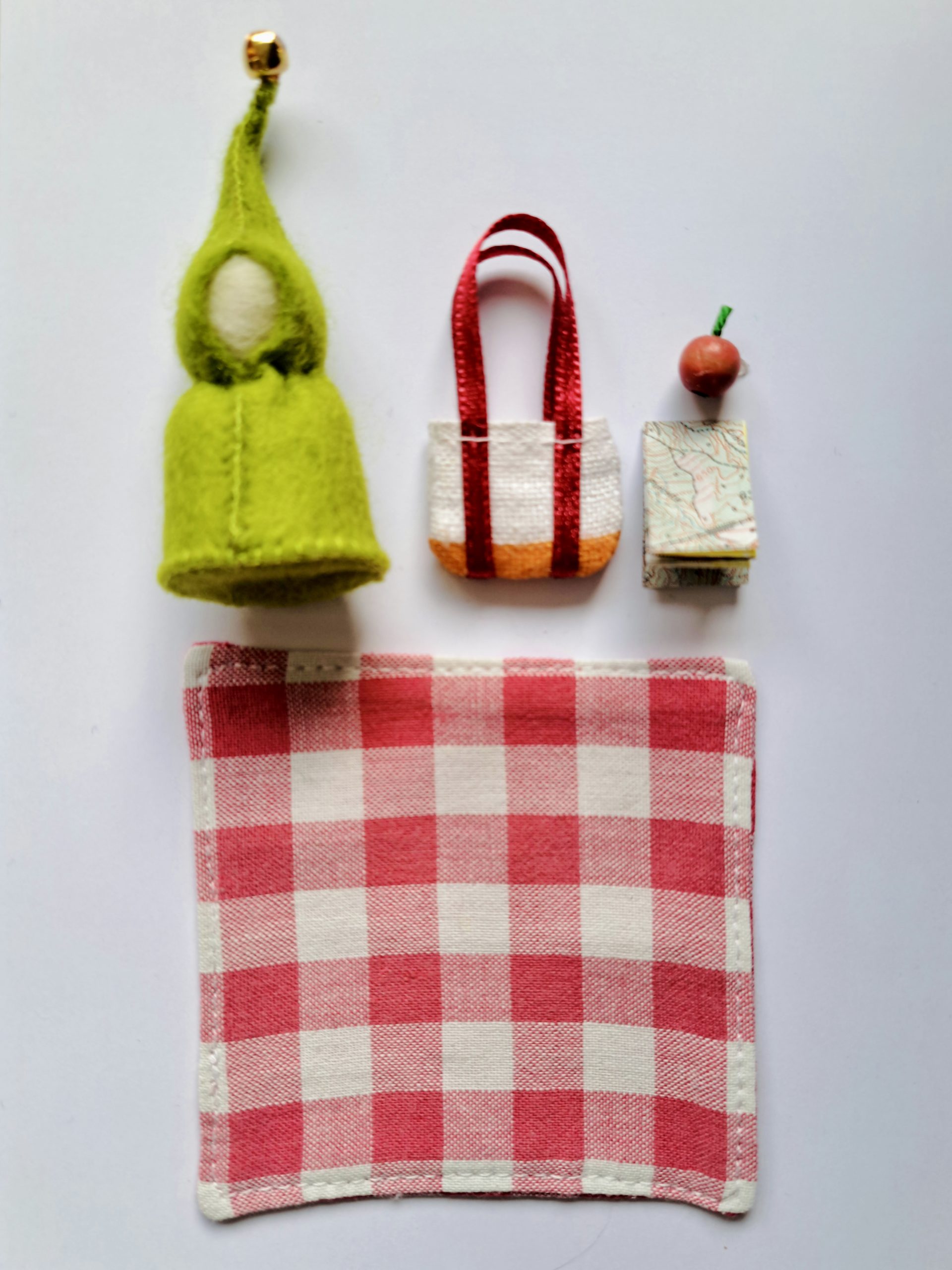 Draadselhandgemaakte tassen, paddenstoelen en kabouters