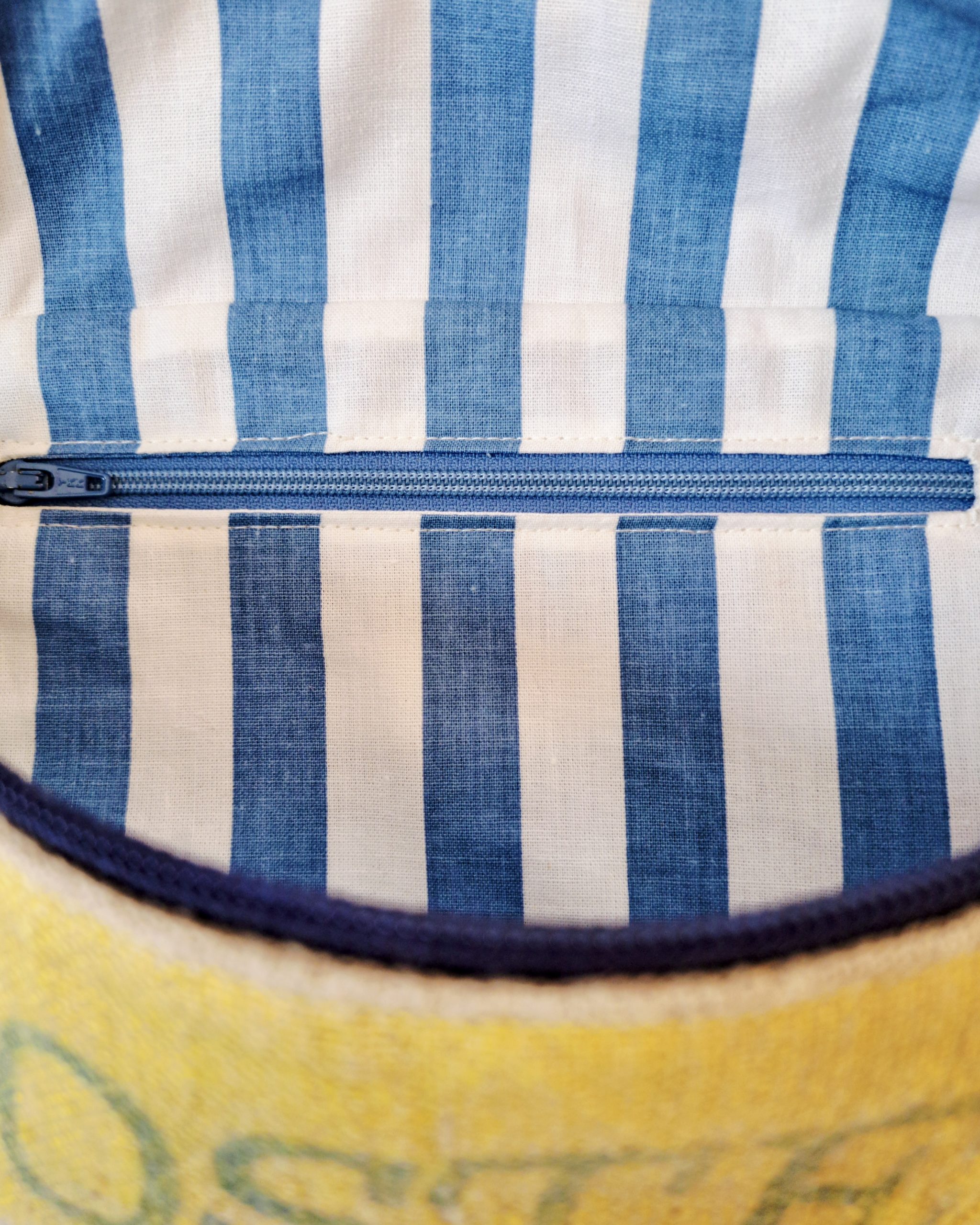 De voering is frisvrolijk gestreept en heeft een binnenvakje met blauwe rits.