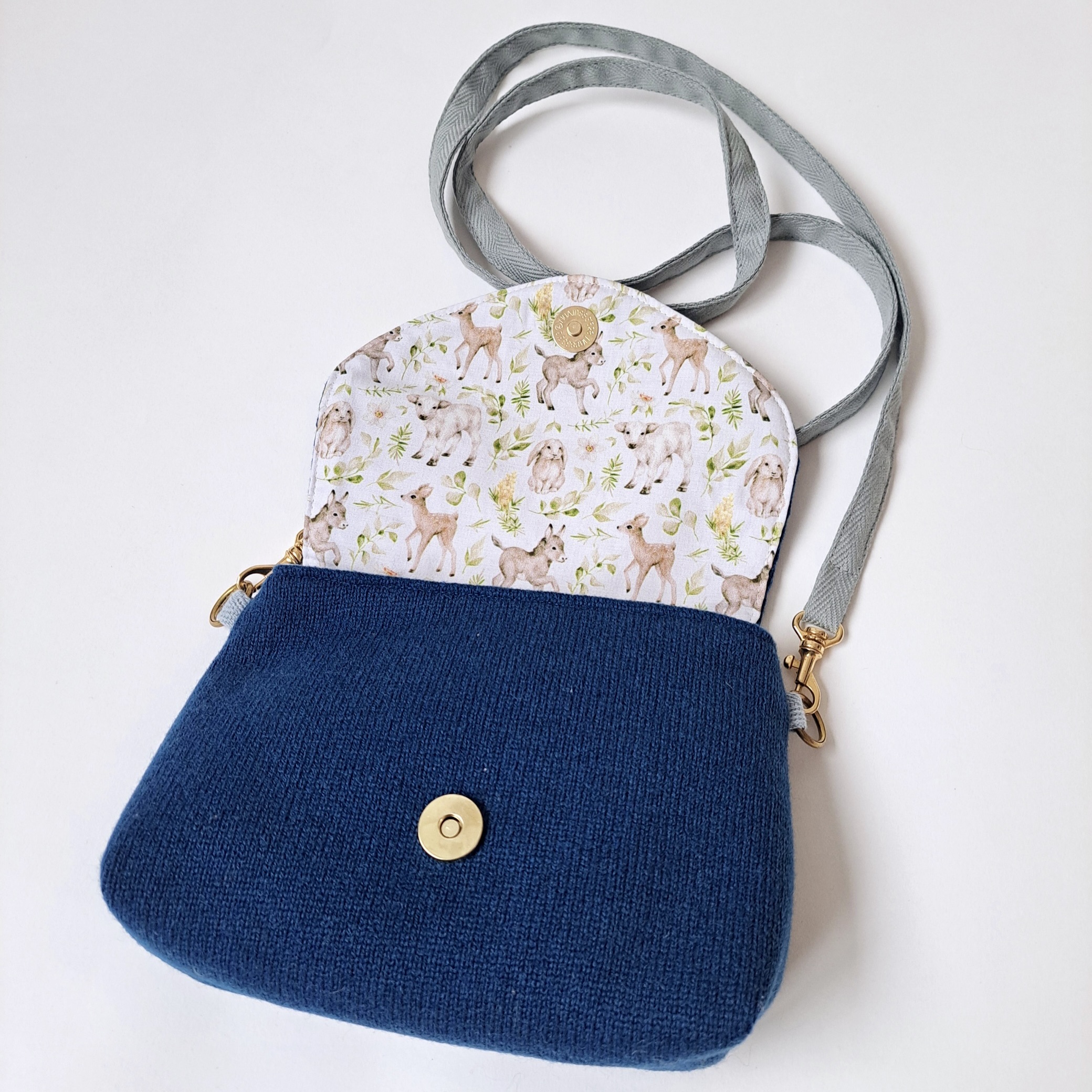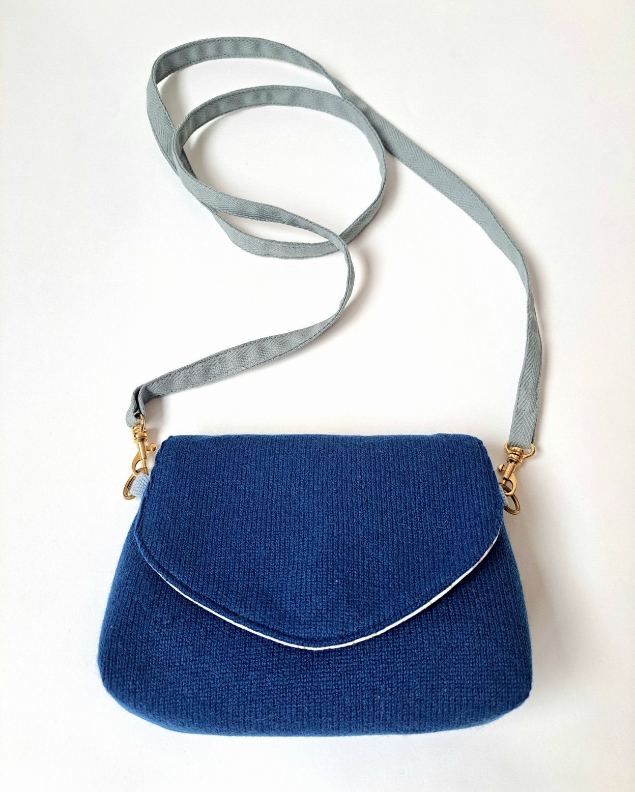 Dit kleine tasje, waar toch een telefoon, portemonnee, bril en sleutelbosje in past, is gemaakt van een gave gekregen trui van fijne blauwe wol.