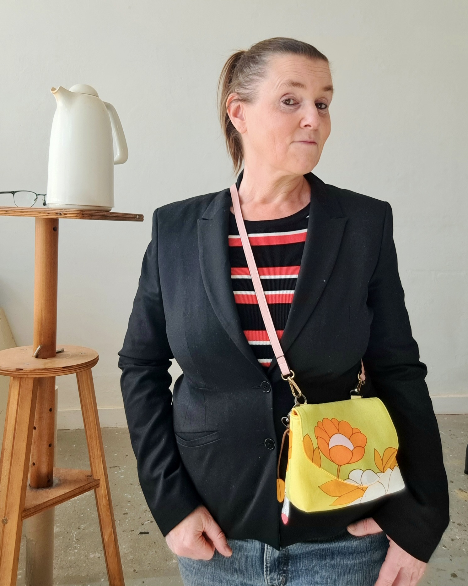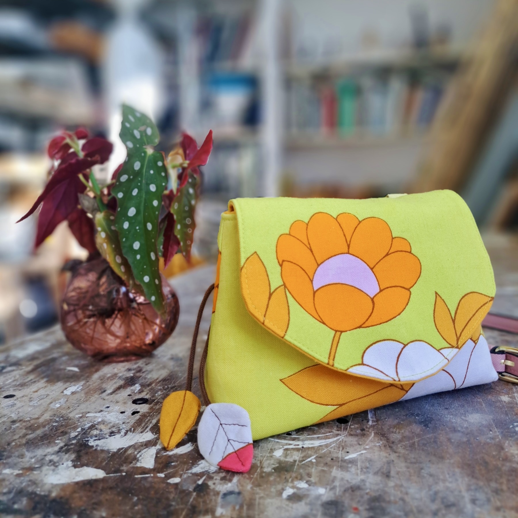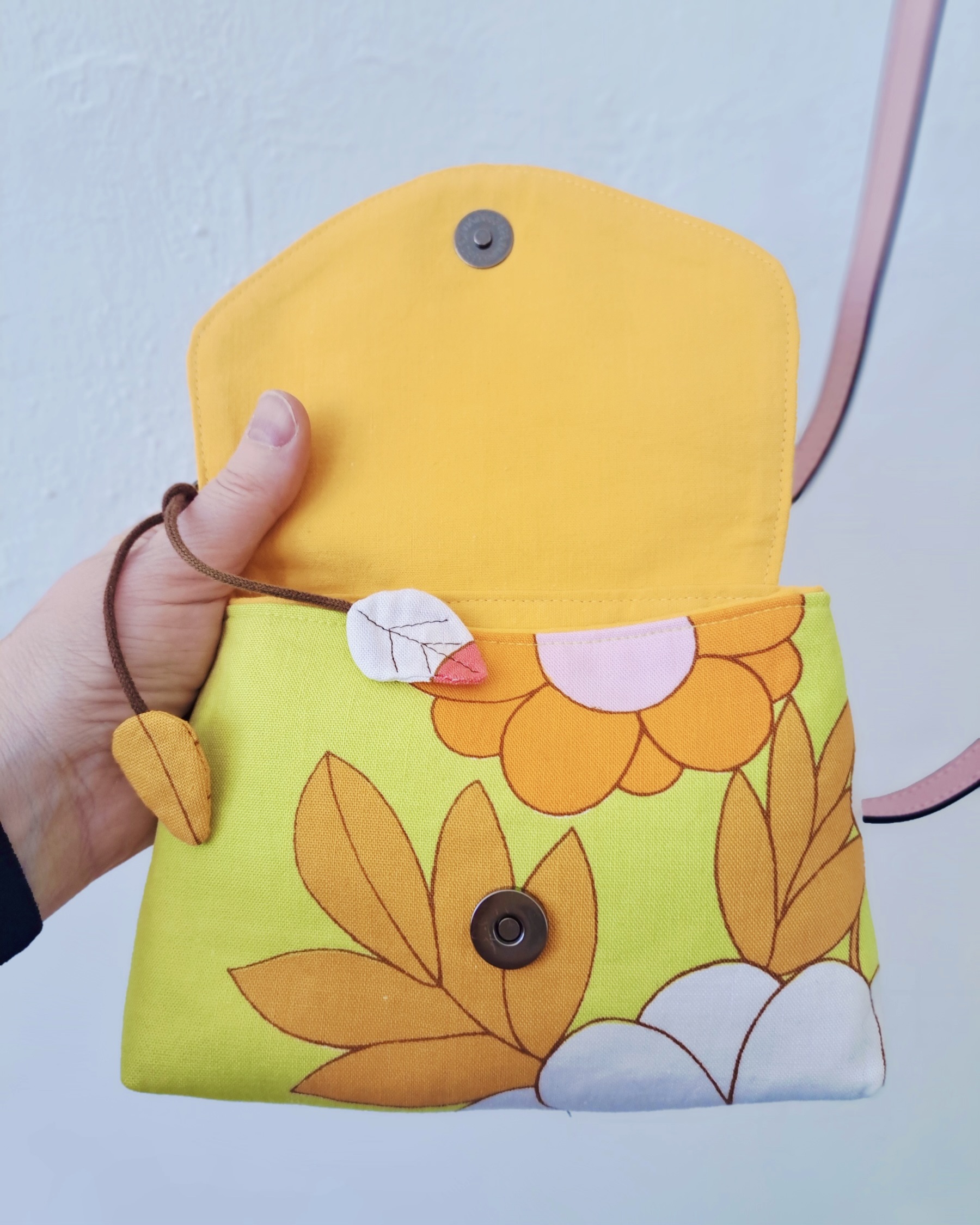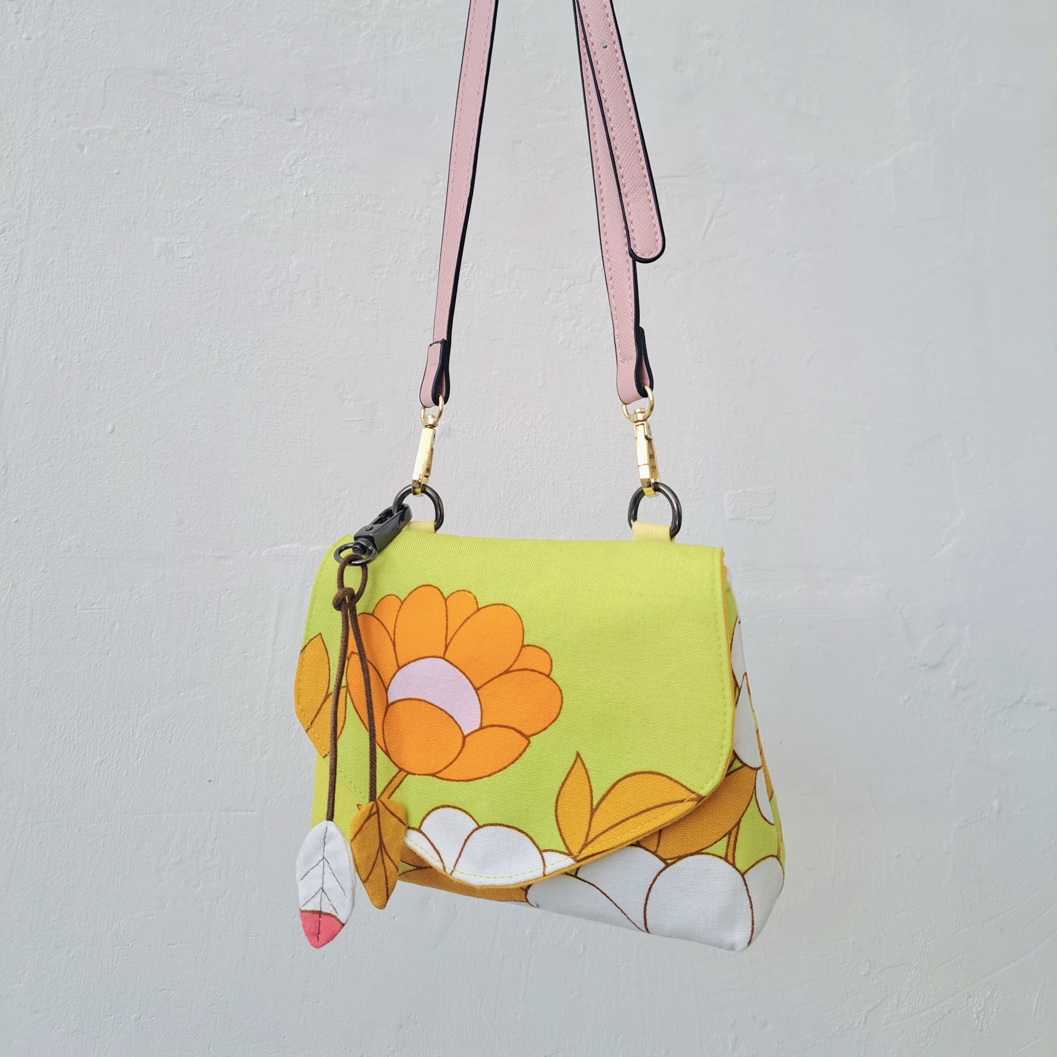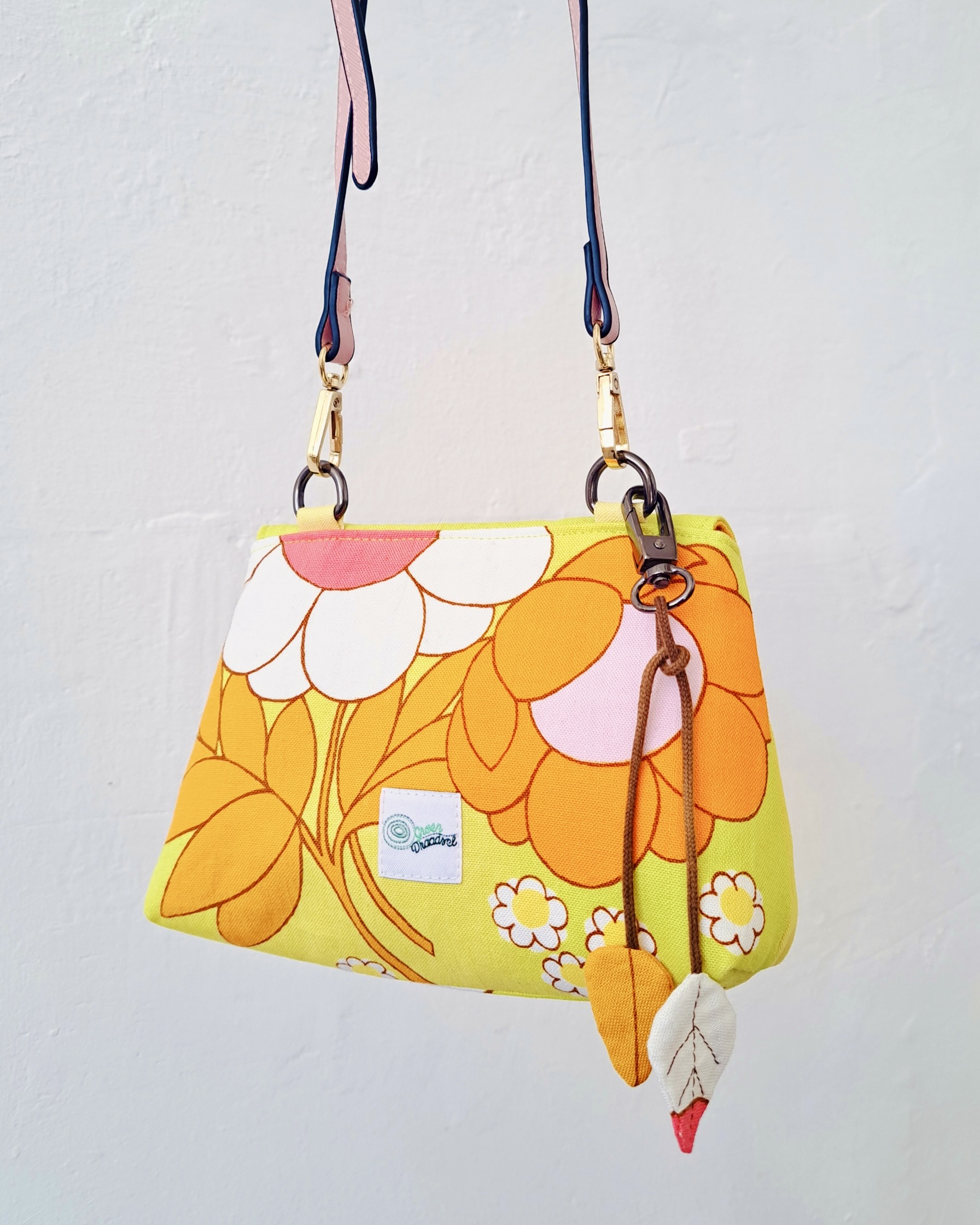 Dit kleine tasje, waar toch een telefoon, portemonnee, bril en sleutelbosje in past, is gemaakt van een theedoek uit de jaren ’70, gevonden bij de kringloop. Het roze riempje met goudkleurige gesp is eveneens ‘pre-loved’.