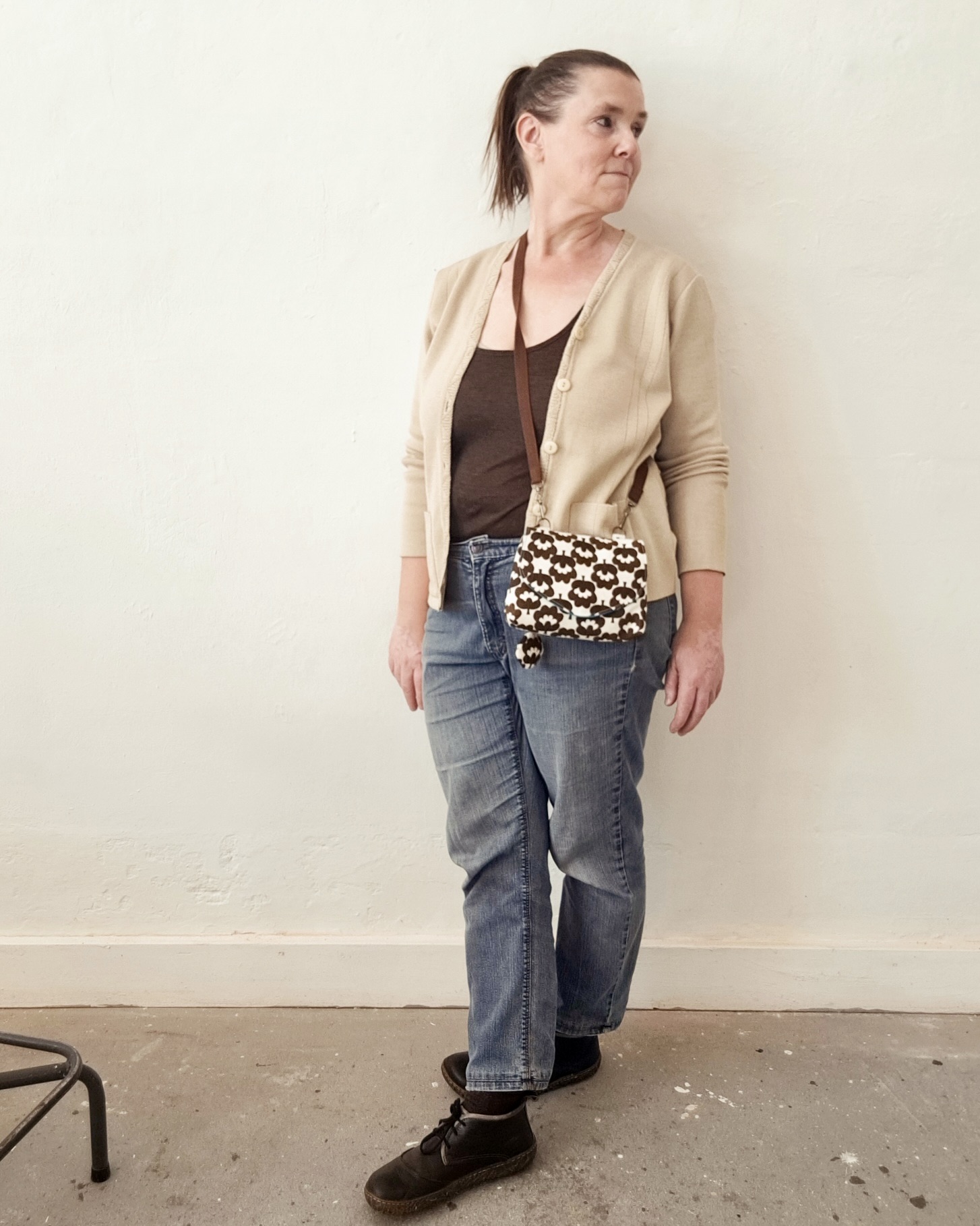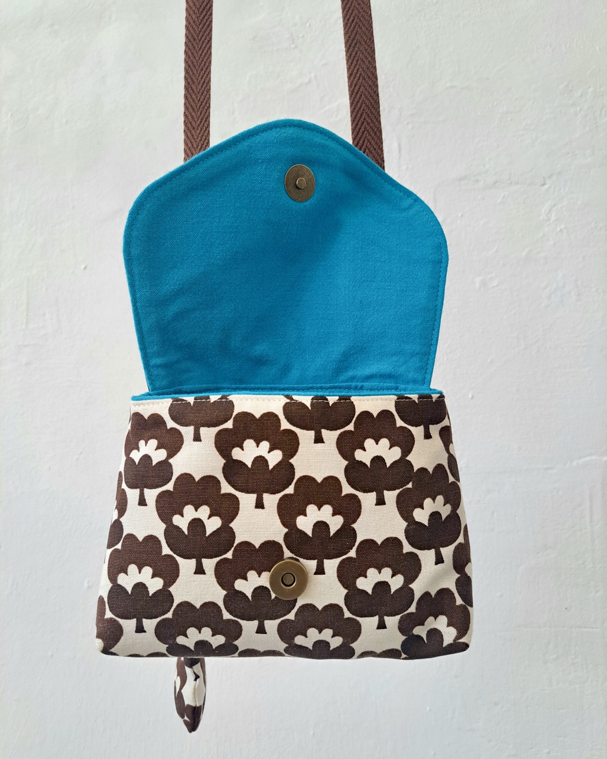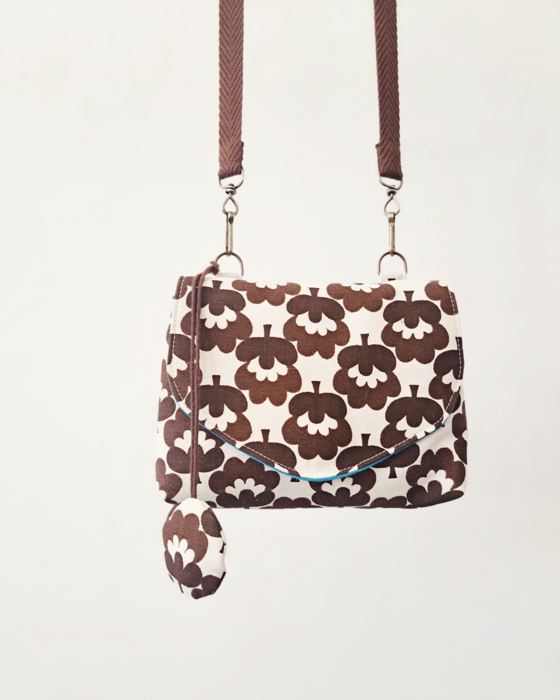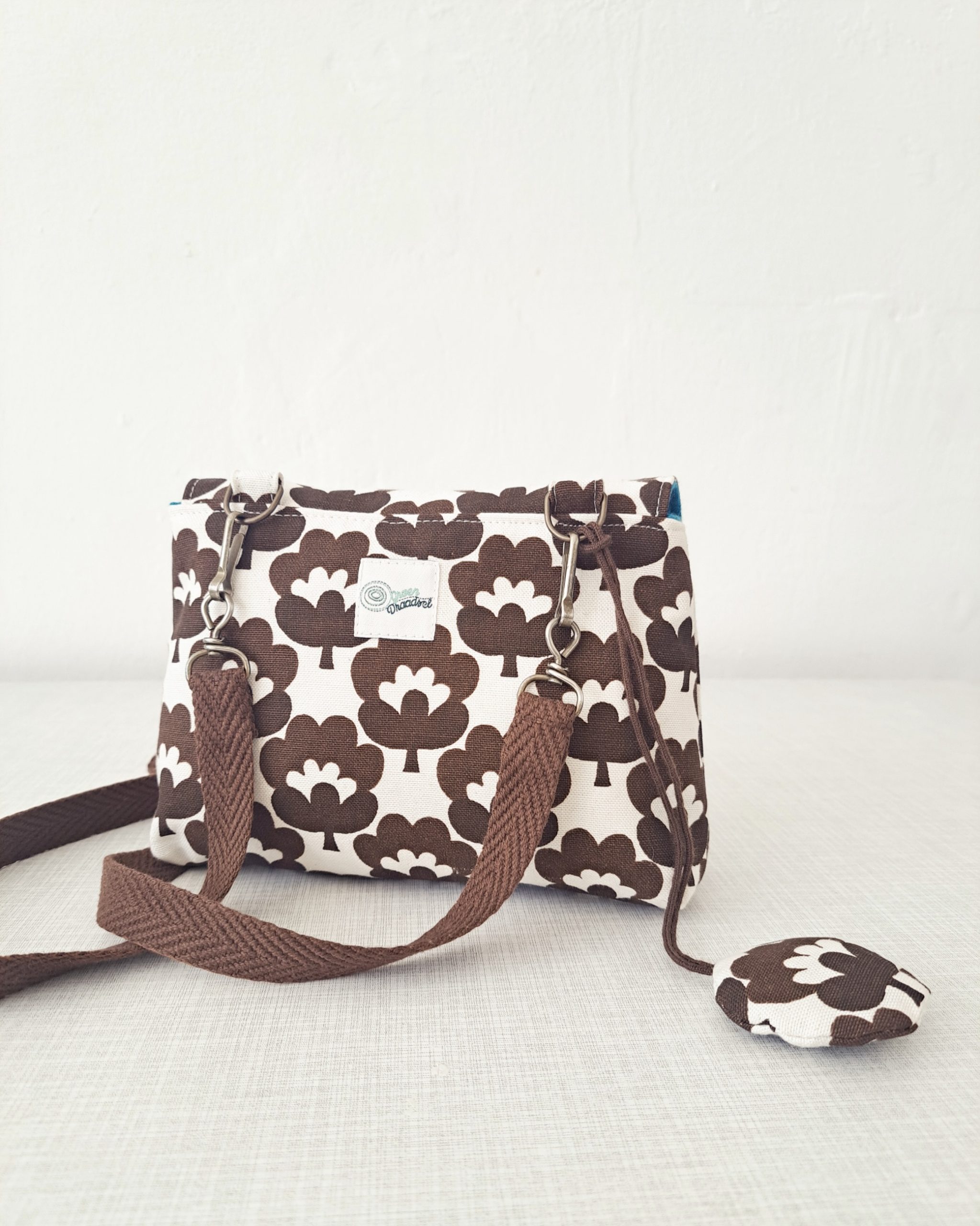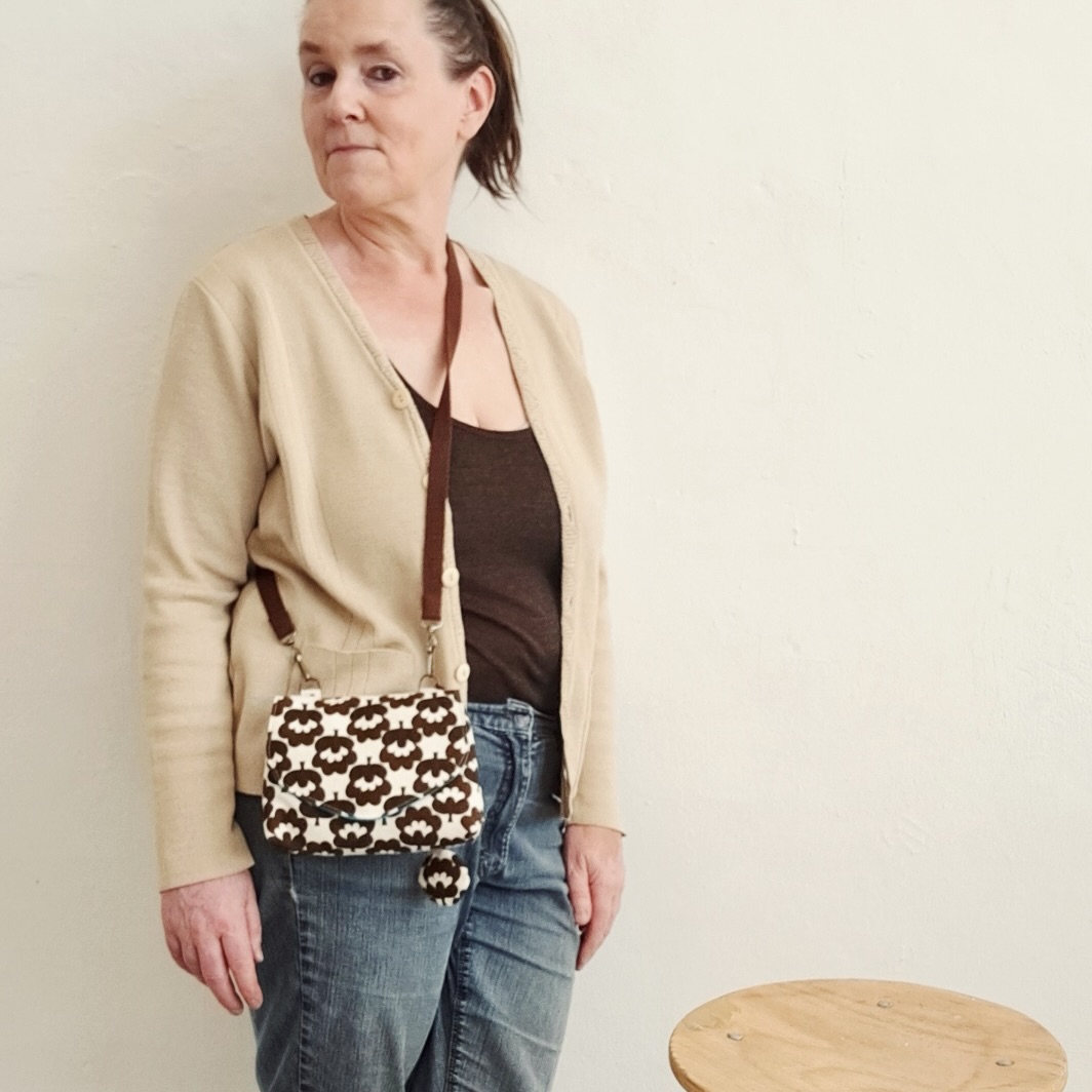 Dit kleine tasje, waar toch een telefoon, portemonnee, bril en sleutelbosje in past, is gemaakt van een stuk vintage stof, gevonden bij de kringloop. Ik vind het leuk dat je het motief zowel als boompjes en blaadjes kunt zien.