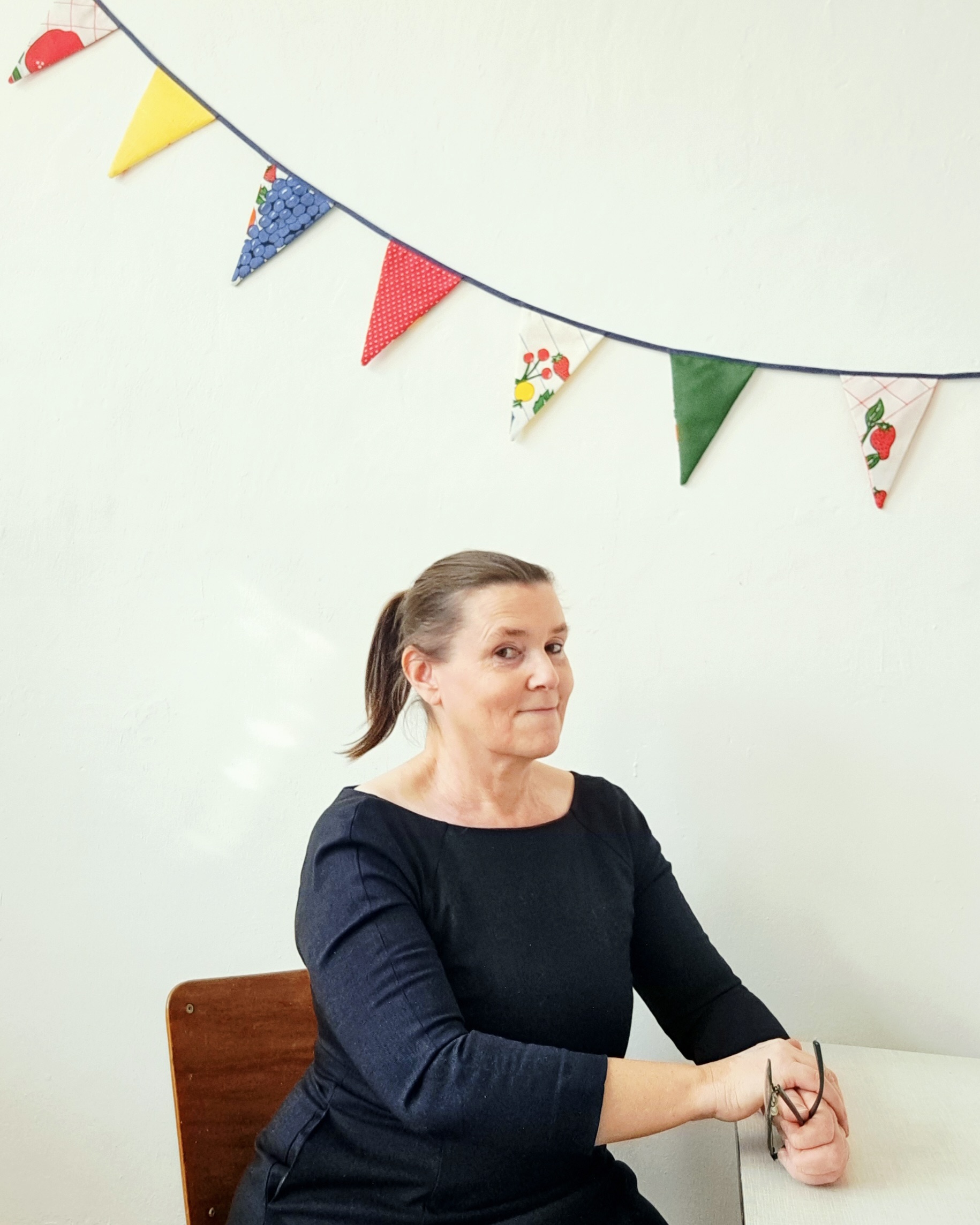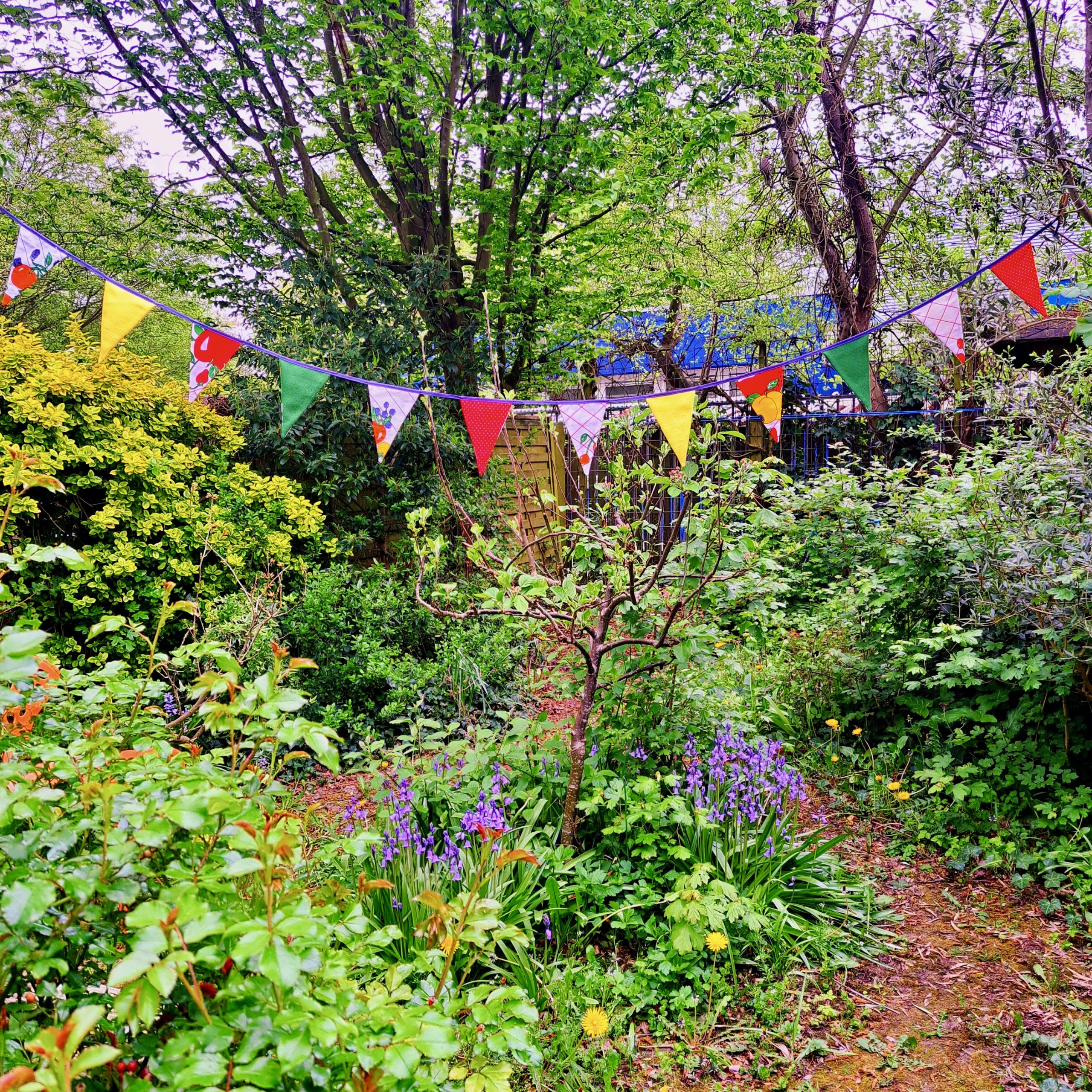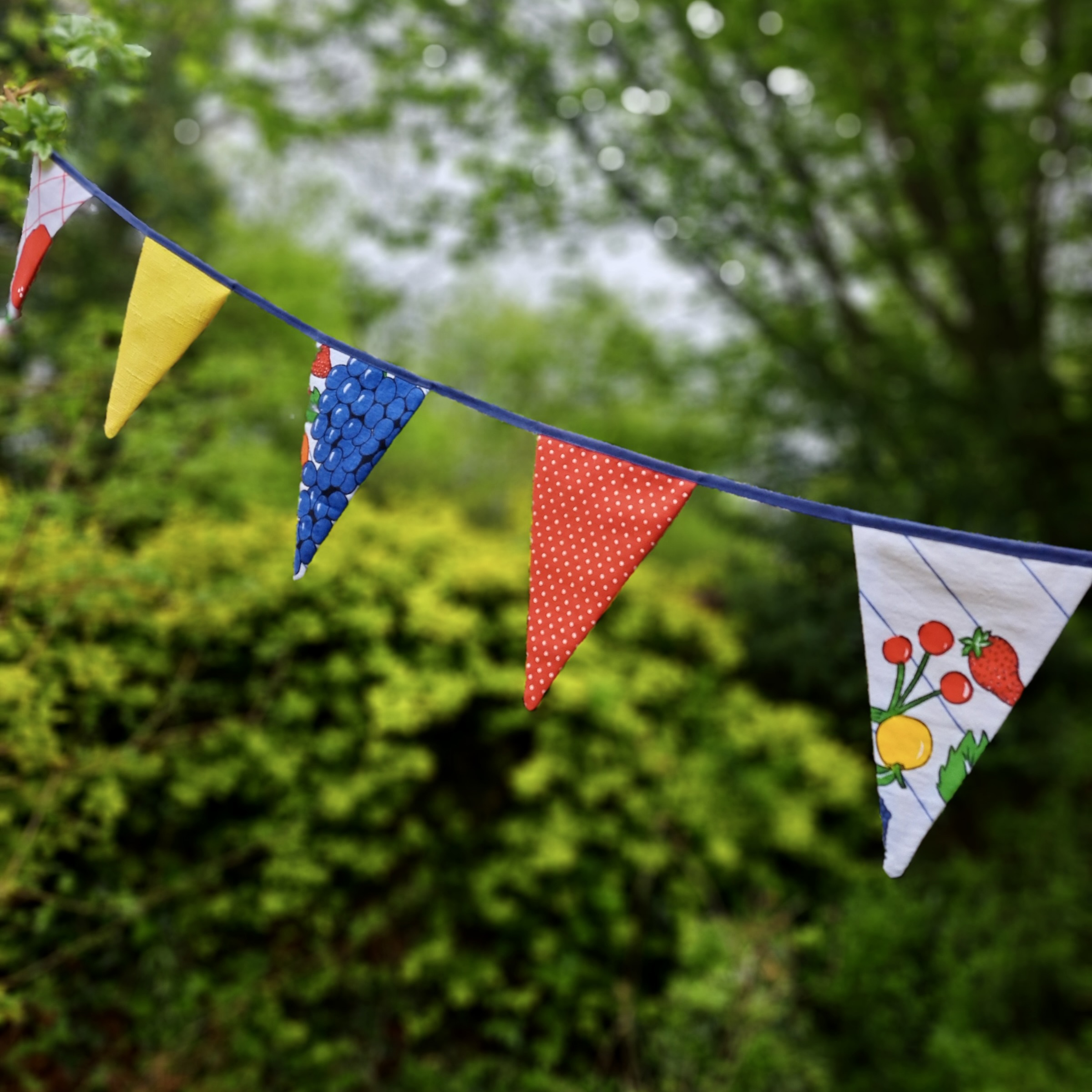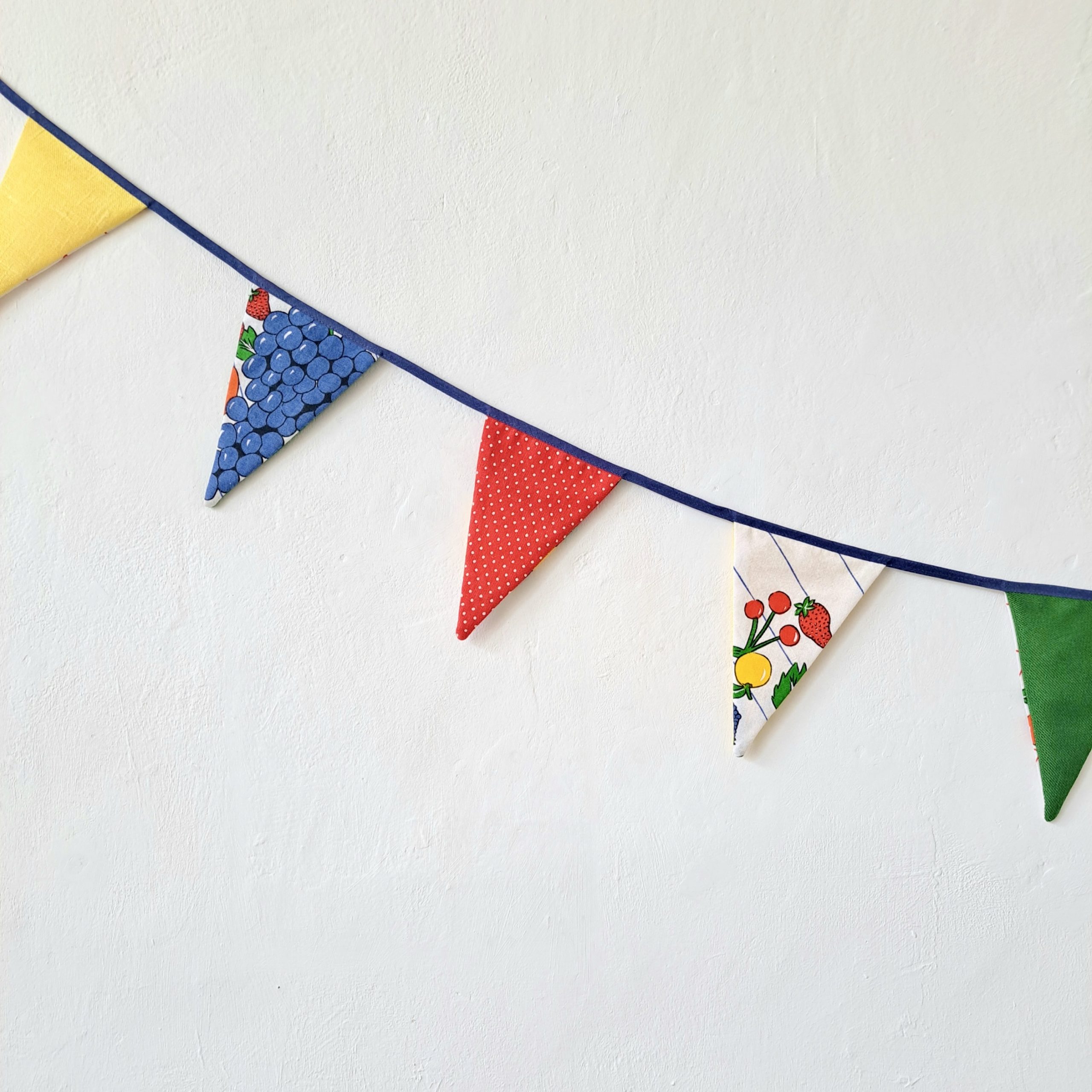 Voor alle kleine en grote feestjes: vrolijke slinger van vintage theedoek met fruit en vrolijk gekleurde restjes.
